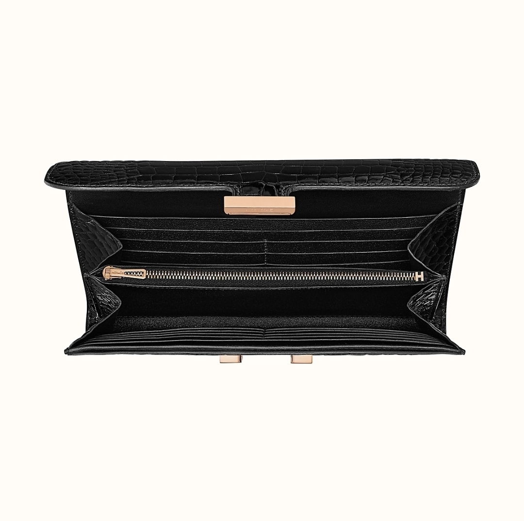 【商品説明】洗練されたエルメスロングウォレット、ローズゴールドとゴールドメッキとラッカー仕上げのクロージャーでかっこよく決まっています。収納抜群のお財布です。クレジットカード入れ×12、紙幣入れ×2、ジッパー式小銭入れ×1、外ポケット×1
