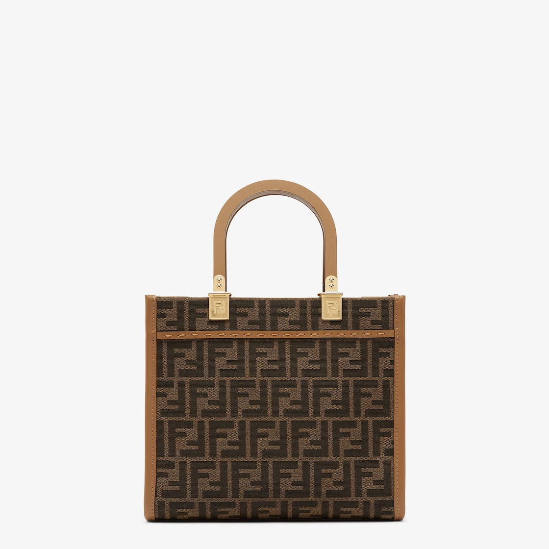 ジャカードのFFモチーフ入りファブリックを使用し、サンドカラーのレザーでFENDI ROMAのレタリングをあしらった、スモールサイズのサンシャイン ショッパーバッグ。サンドカラーに彩ったハンドル。