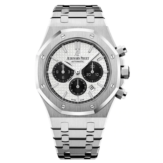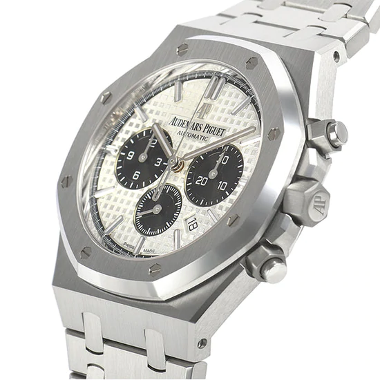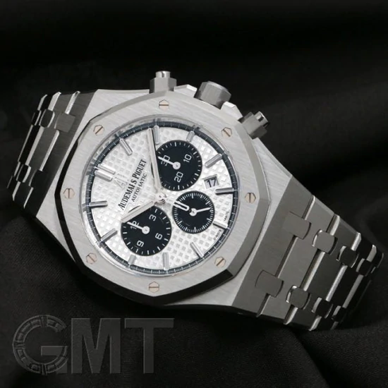 「グランドタペストリー」模様のシルバーダイヤル、ブラックのカウンターとインナーベゼル、ホワイトゴールド製アプライドアワーマーカーと蓄光処理を施したロイヤルオーク針。
