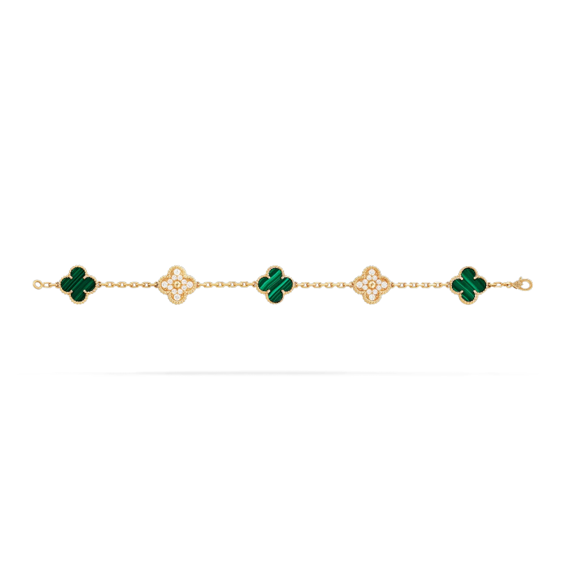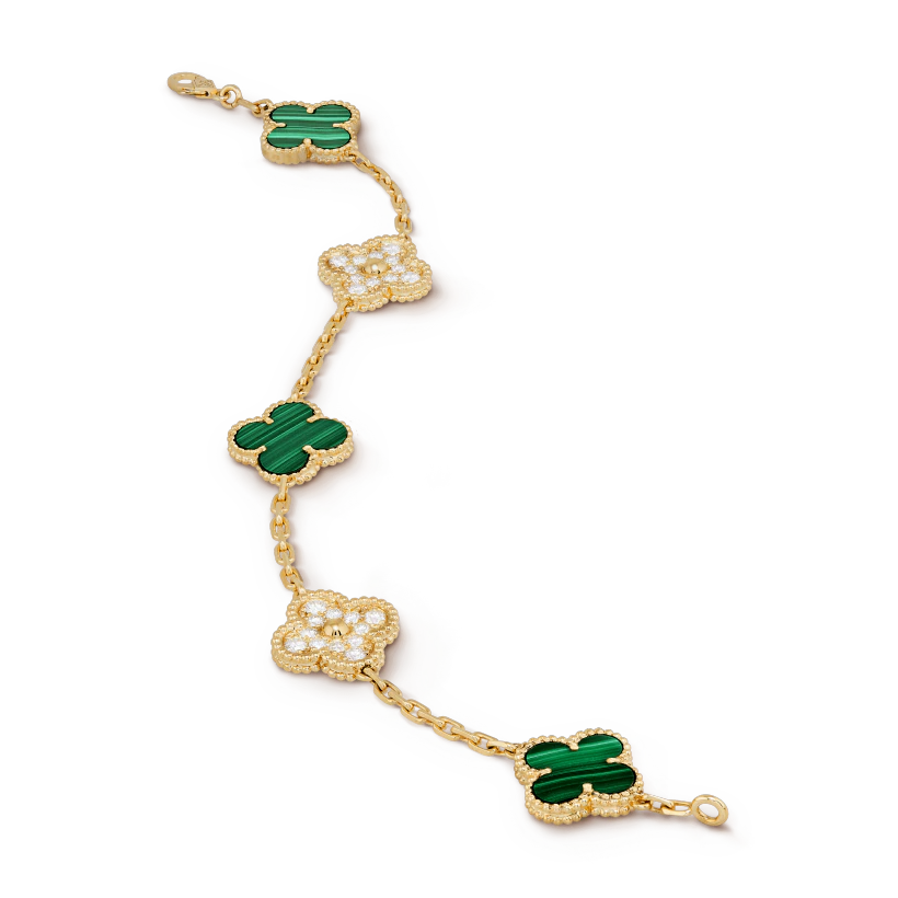 ヴィンテージ アルハンブラ ブレスレット、5モチーフ、イエローゴールド、マラカイト、ラウンドカット ダイヤモンド DEF IF~VVS