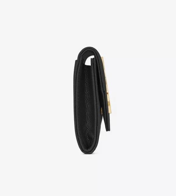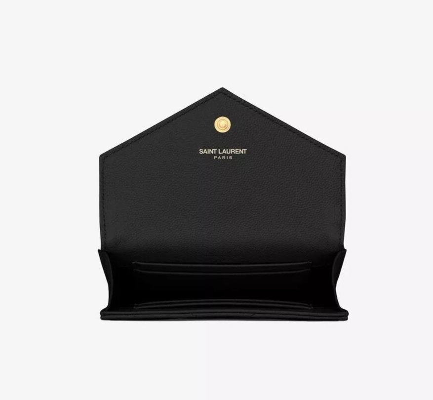 YSLメタルのロゴとキルティングの表面ステッチが施されたフラップウォレット。
