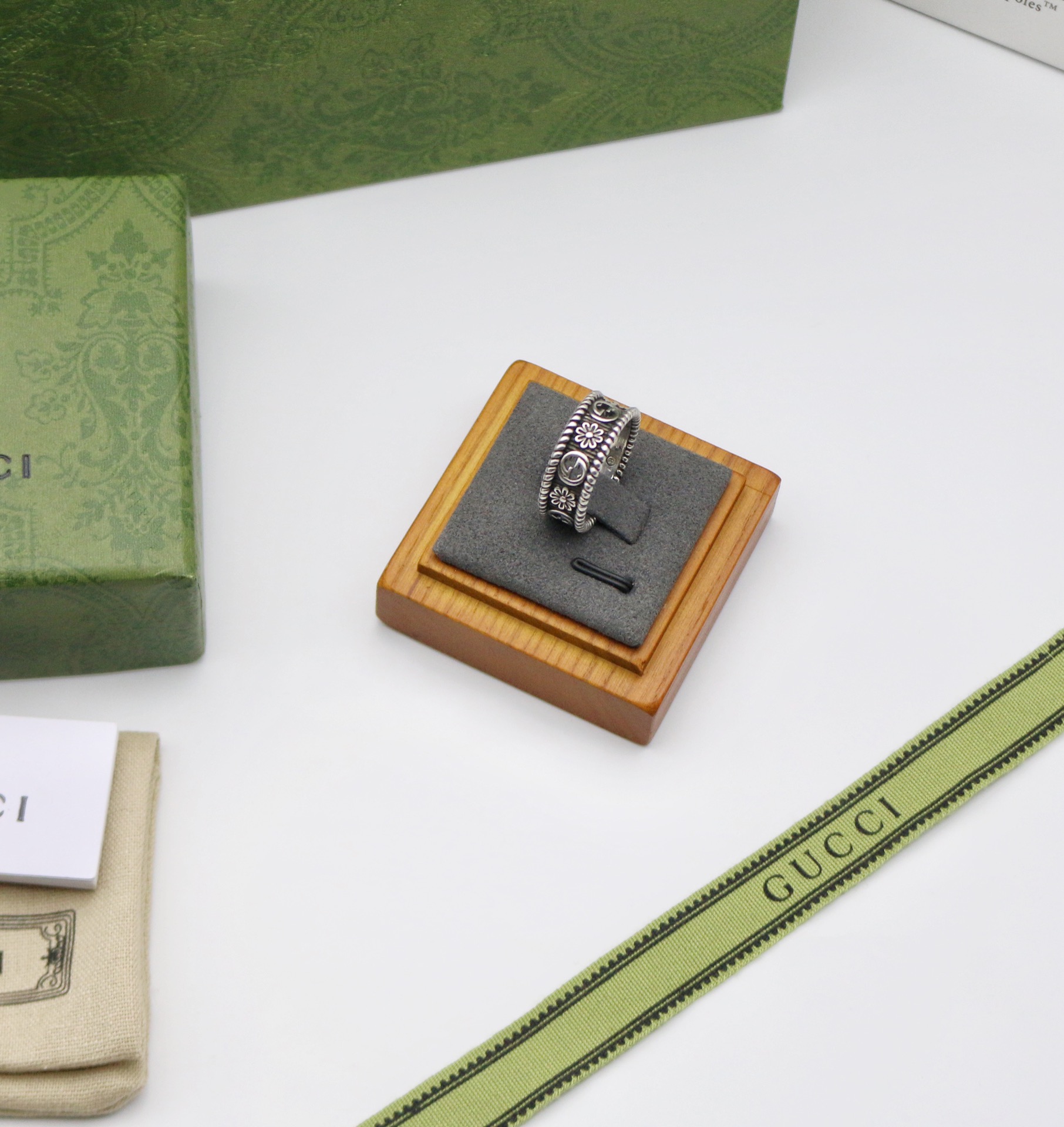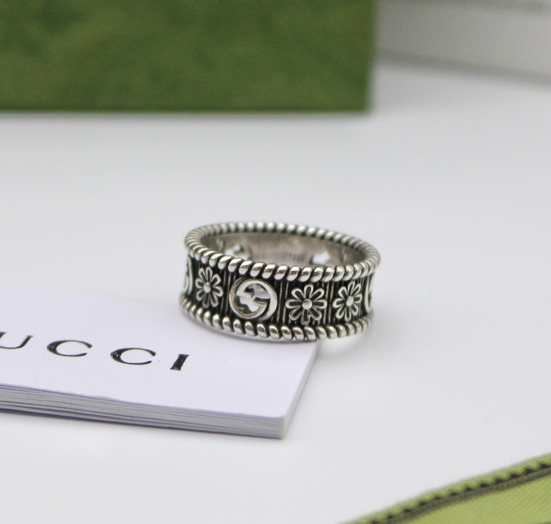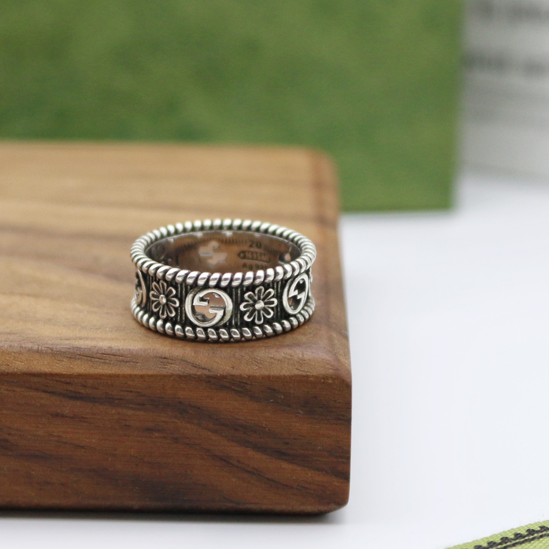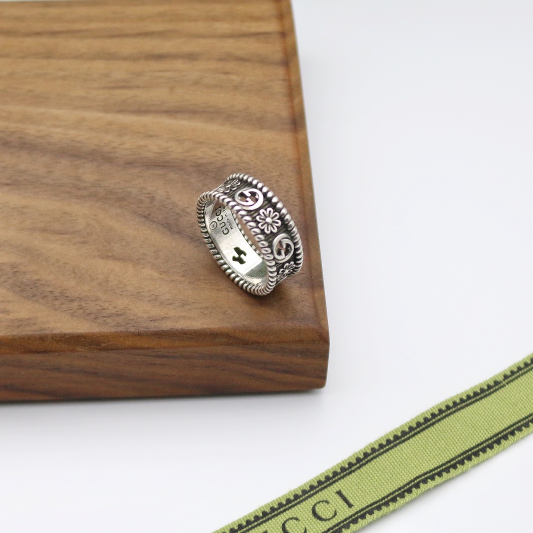インターロッキングGのカットアウトモチーフとフラワーのエングレービングが交互に配された、スターリングシルバーのリング。テクスチャード トーション トリムで仕上げられています。創設者グッチオ・グッチへのオマージュであり、グッチを象徴するインターロッキングGのモチーフを、遊び心のある解釈でプレシャスなアクセントと合わせたアイテムです。